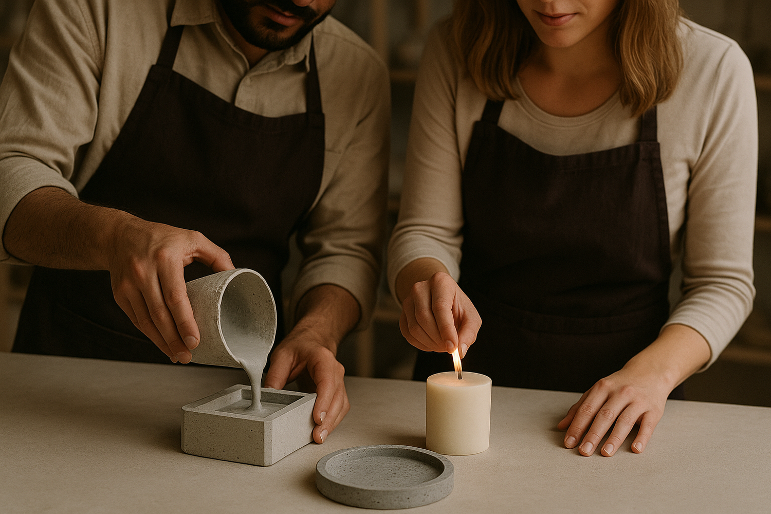 Créé par un couple franco-yémenite, notre atelier donne vie à des décors en béton et des bougies parfumées, façonnés à la main ici en France.