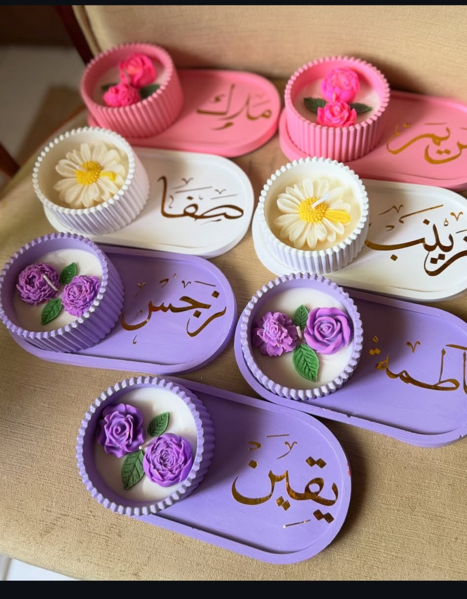 Cette bougie parfumée est fabriquée dans un contenant en éco-résine minérale deposé sur un mini plateau ovale à base de résine minérale personnalisable.