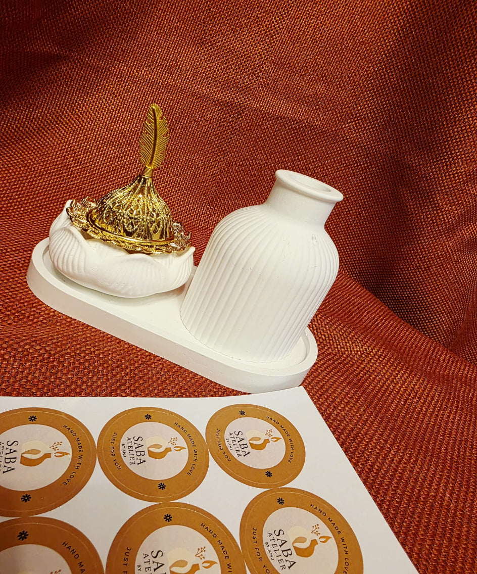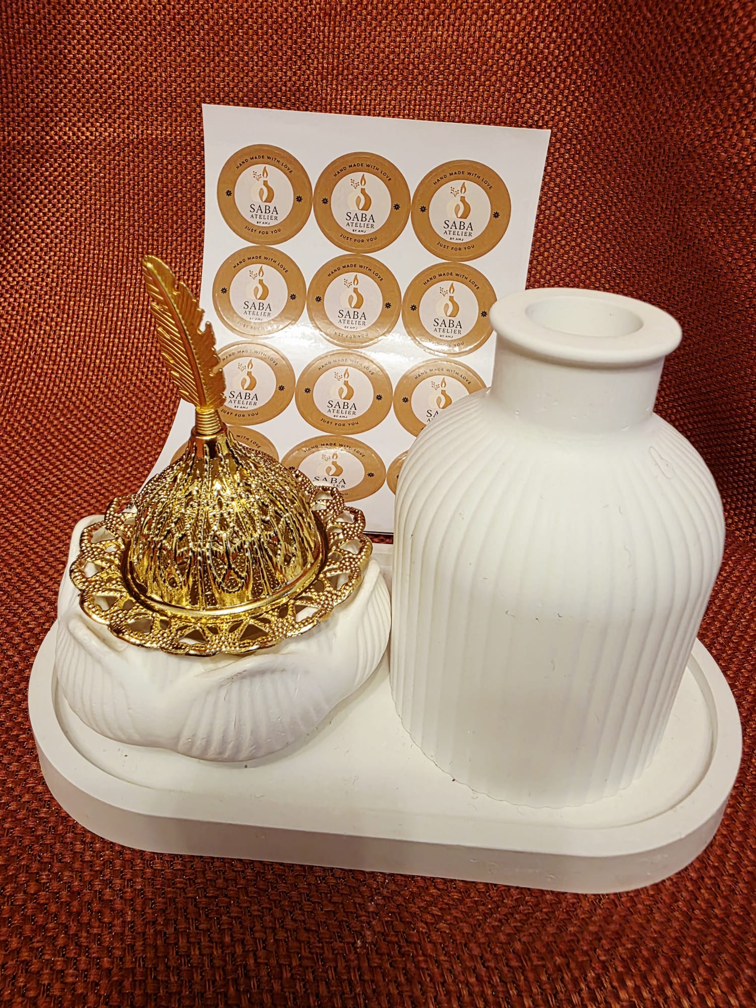 Cet ensemble hand made rassemblant un bruleur d'encens elegant au forme de fleur et un pot de fleur (avec la fleur souhaitée) est deposé sur un mini plateau ovale. Chaque piece peut servir pour d'autres utilisation de décoration interieur . Le tout forme une decoration sublime rendant elegants vos beaux interieurs.