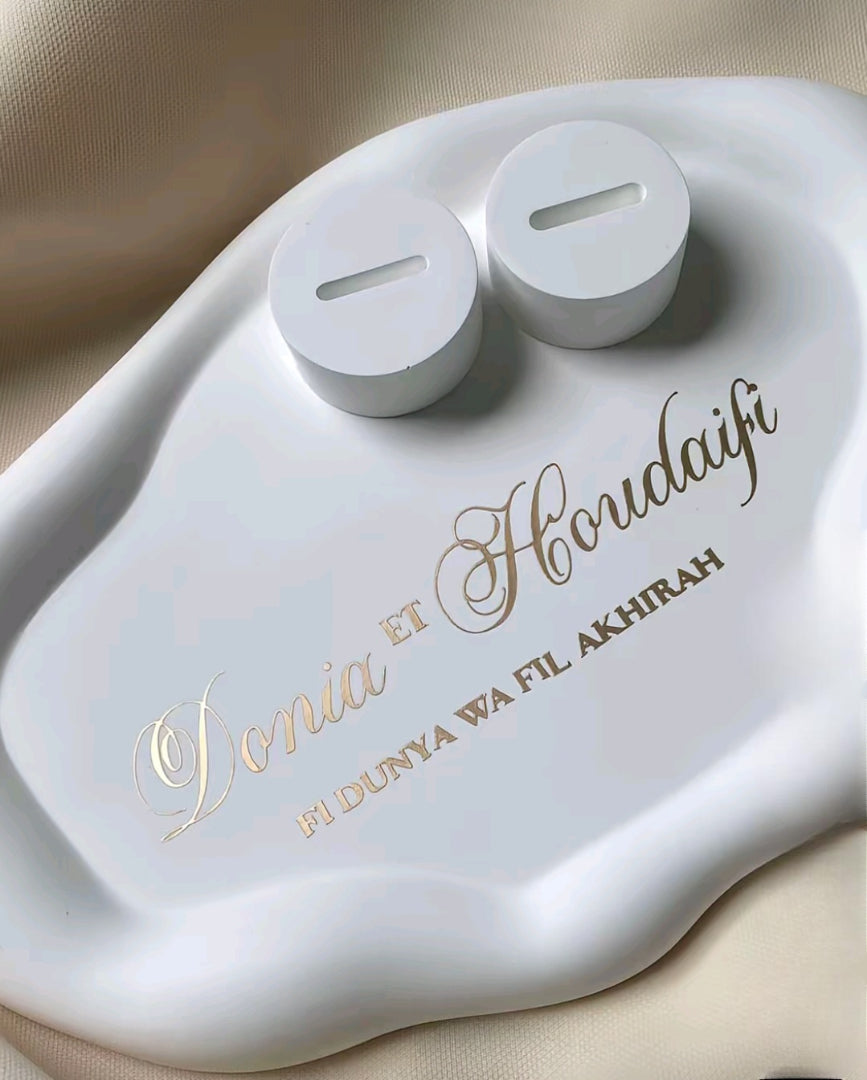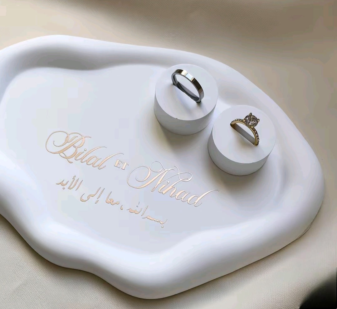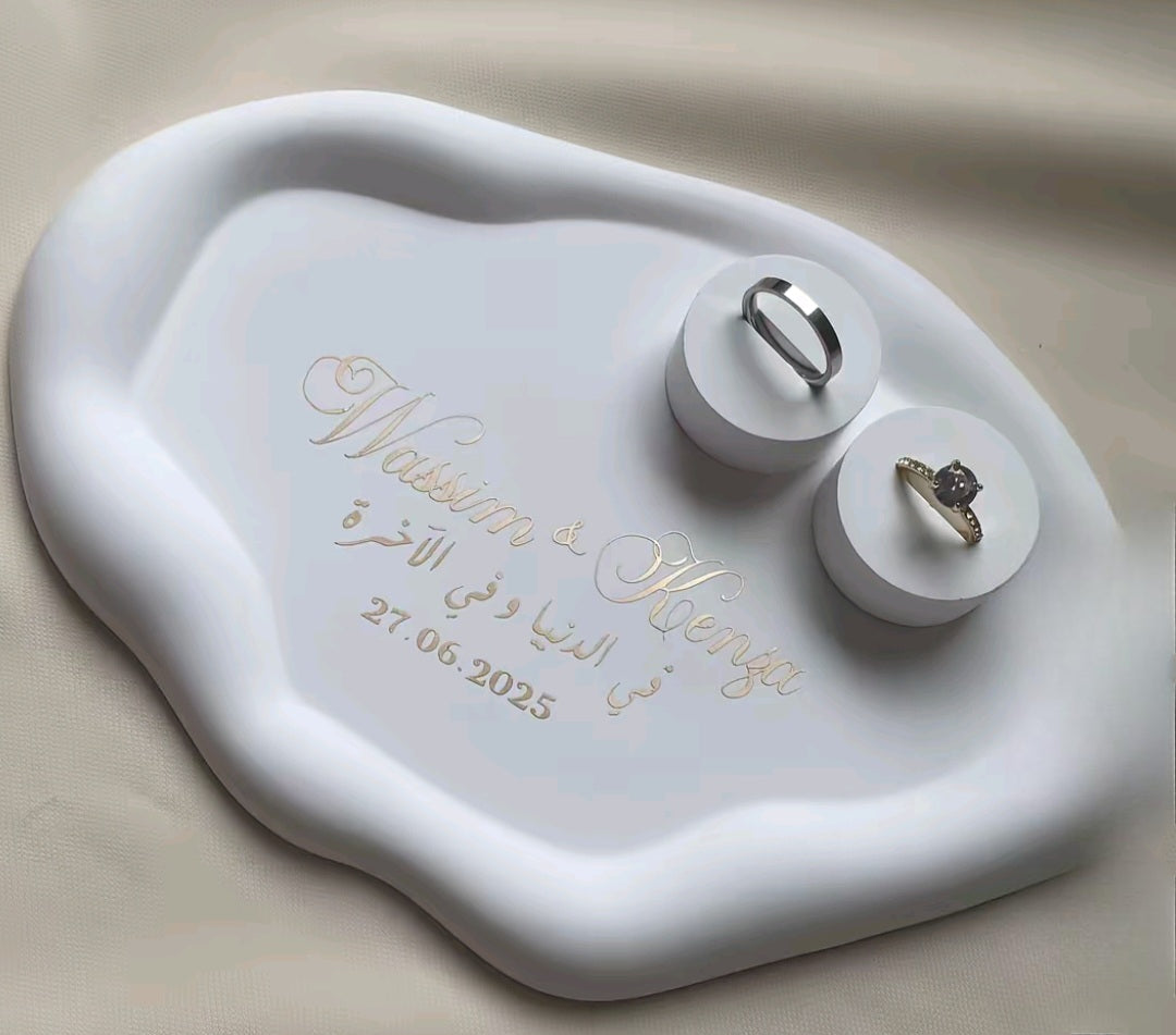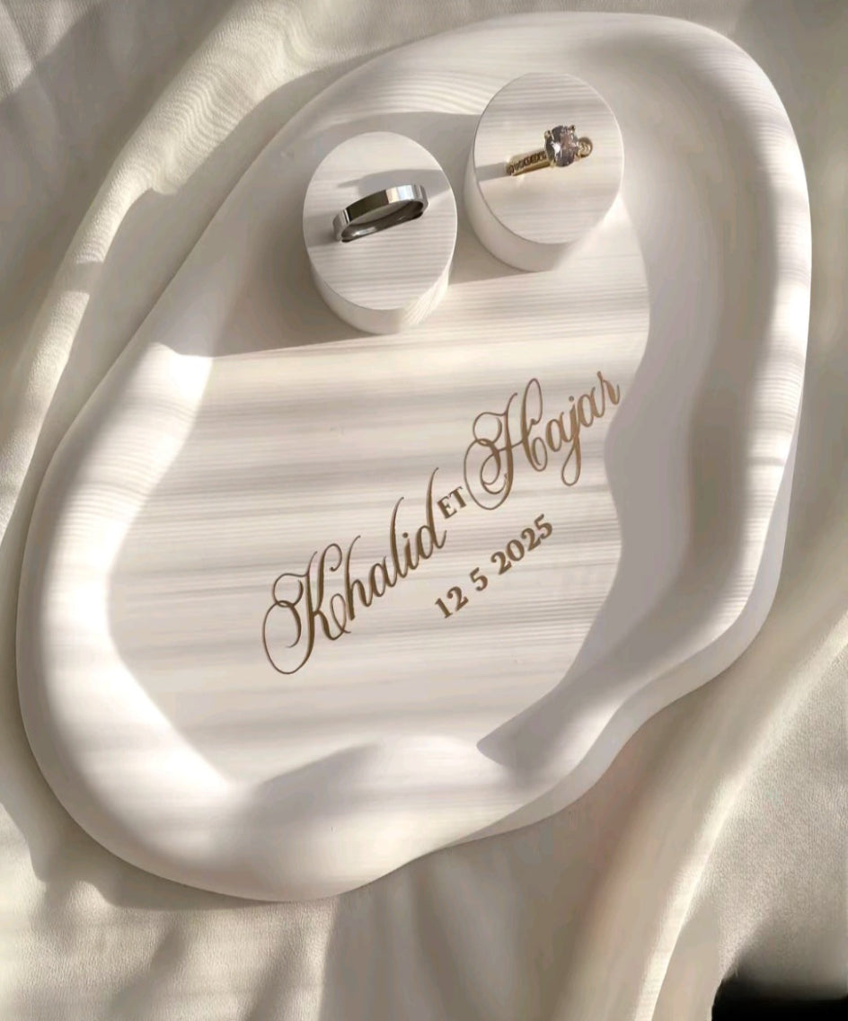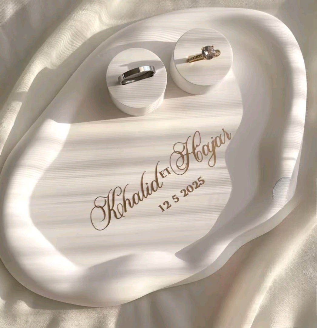 Immortalisez votre ceremonie de fiancailles ou de mariage grâce à un porte-alliance nuage en éco-résine minérale, entièrement fabriqué à la main pour conserver précieusement ces souvenirs uniques. L'espace bagues est également en éco-résine minérale.